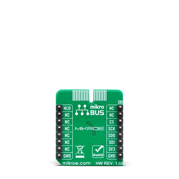 This Click board™ uses the SPI communication interface and is designed to be operated only with a 3.3V logic level. A proper logic voltage level conversion should be performed before the Click board™ is used with MCUs with different logic levels.
