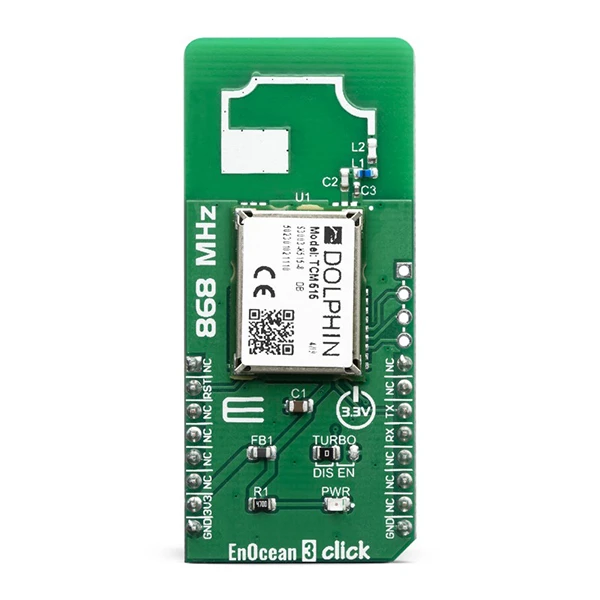 EnOcean 3 Click carries an ultra-low power TCM515 transceiver gateway module which operates at 868MHz radio band, perfectly suited for the realization of transceiver gateways, actuators and controllers for systems communicating based on the EnOcean radio standard. For communication to other devices we have implemented PCB antenna on the board making this Click ready to use device which can filter, decrypt and authenticate traffic before forwarding it to the processor or PC over UART.
