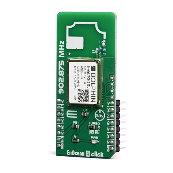 EnOcean 4 Click carries a ultra-low power TCM515U transceiver gateway module which operates at 902MHz radio band, perfectly suited for the realization of transceiver gateways, actuators and controllers for systems communicating based on the EnOcean radio standard. For communication to other devices we have implemented PCB antenna on the board making this Click ready to use device which can filter, decrypt and authenticate traffic before forwarding it to the processor or PC over UART.