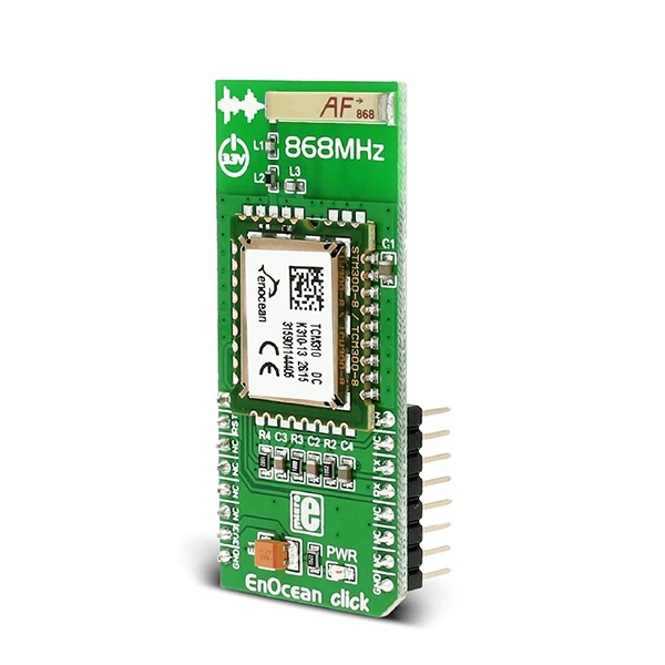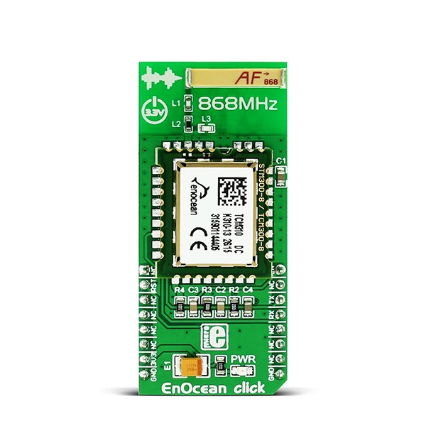 EnOcean Click carries a TCM 310 transceiver, which is a bidirectional gateway for EnOcean’s 868 MHz radio systems. The Click is designed to run on a 3.3V power supply. It communicates with the target MCU through UART (TX, RX pins), with additional functionality provided by RST and EN pins.