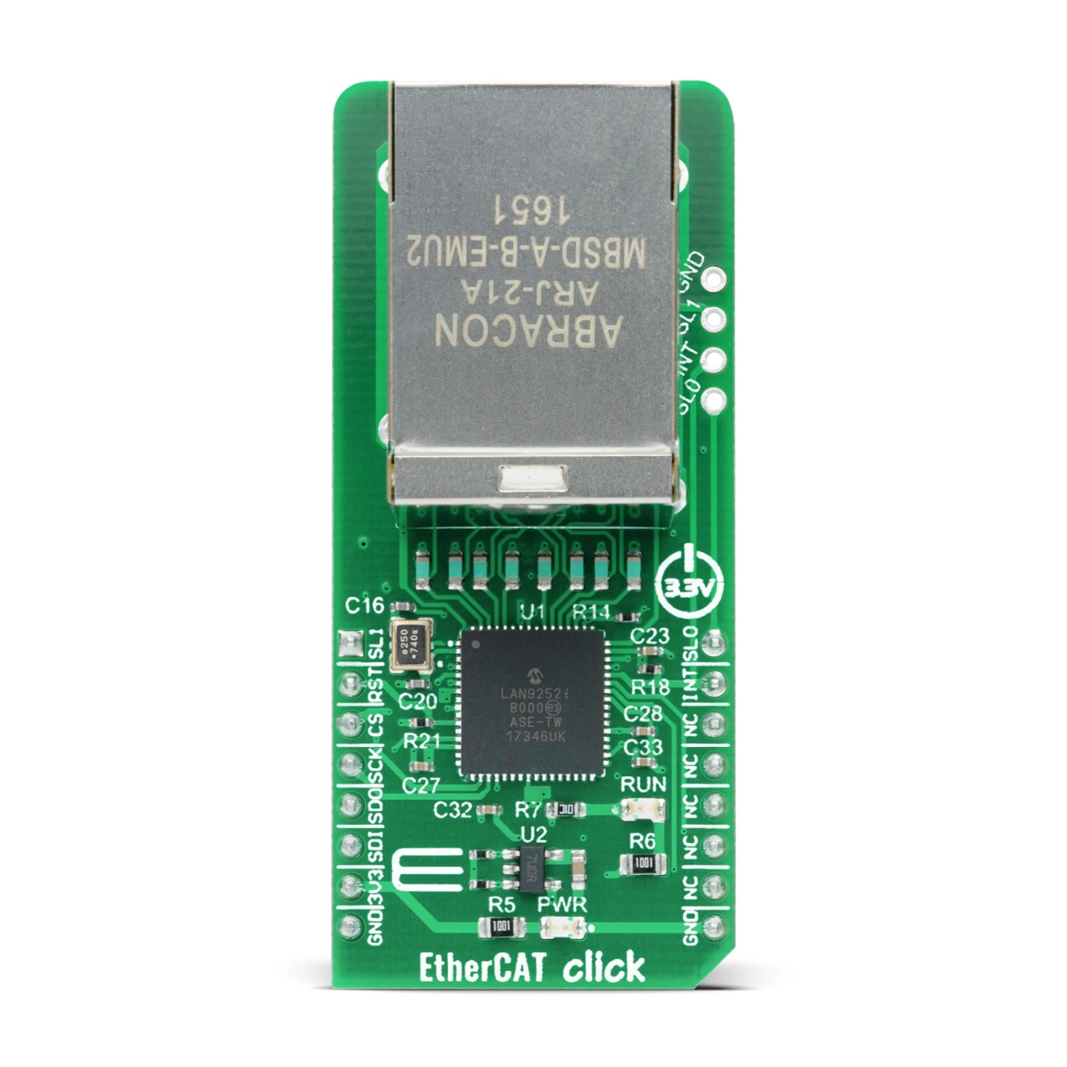 EtherCAT Click is a compact add-on board that provides a cost-effective solution for realizing EtherCAT device solutions on various processors over the SPI interface. This board features the LAN9252, a 2-port EtherCAT device controller with dual integrated Ethernet PHYs from Microchip Technology. Each PHY contains a full-duplex 100BASE-TX transceiver and supports 100Mbps operation. The LAN9252 supports HP Auto-MDIX, allowing the use of direct connects or cross-over LAN cables. It communicates with MCU via a synchronous device SPI/SQI interface and can operate in Digital I/O Mode, where signals can be controlled or monitored by the EtherCAT Controller. This Click board™ is suitable for industrial control, process/factory automation, hydraulic and pneumatic valve systems, power, and many more.