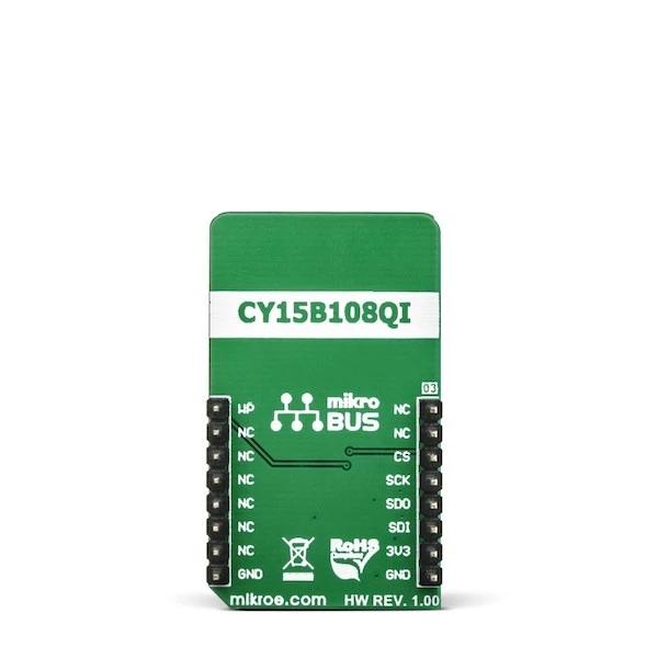 Excelon LP Click uses the CY15B108Q, a serial FRAM module with 8 Mbit density. Although the FRAM is still being developed, this company managed to provide a very reliable and fast FRAM module that can write data at bus speed, has an extremely high endurance of 1014 read/write cycles, data retention period of 151 years, and very fast SPI interface.