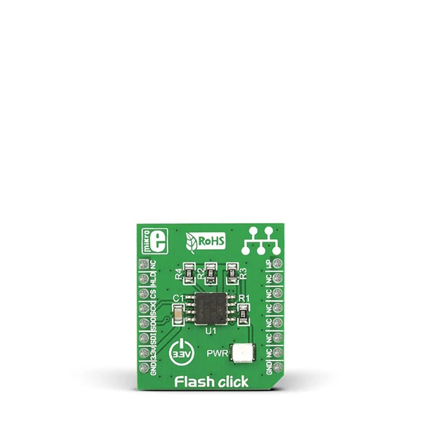 MIKROE Flash Click is 8,388,608 bits (8 Mbit) on a Click board™, organized into 1,048,576 bytes (1 MB). In other words, this Click board™ is a flash memory medium with the capacity of 1 MB. The used flash module has very good endurance and it can withstand up to 100,000 write cycles, with the data retention period of about 20 years. The flash memory IC used on this Click board™, features Serial Flash Discoverable Parameters (SFDP) mode, used to retrieve the advanced information from the device, such as the operating characteristics, structure and vendor specified information, memory size, operating voltage, timing information, and more.