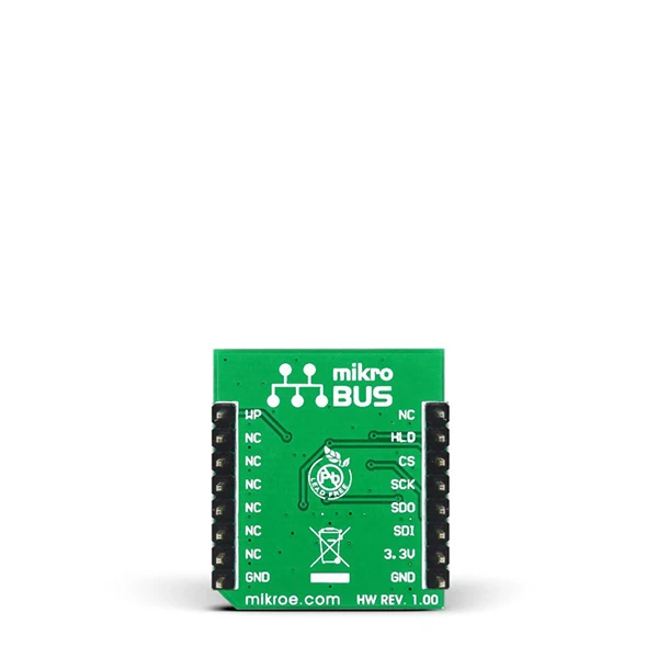 The #WP pin is used to lock the Status Register. When this pin is driven to a LOW level, no further modifications to the Status register are possible and the instructions used to change bits in this register (Write Enable and Write Status Register) are completely ignored. Driving this pin to a LOW state effectively acts as the hardware memory write-protect lock mechanism. This pin can be completely disabled by the WPEN bit of the status register. The #WP pin is routed to the mikroBUS™ PWM pin, and it is labeled as HLD.