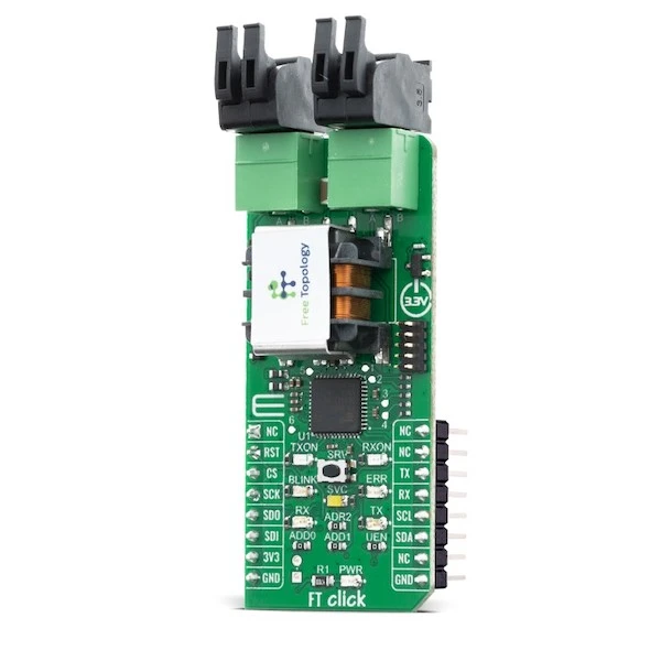 FT Click is a compact smart transceiver add-on board that helps you add a Free Topology (FT) interface to any host board with the mikroBUS™ socket. Leveraging FT, the most reliable and easiest-to-scale wired communications media, FT Click lets you network sensors and devices to create IoT solutions for automation and control networks that are easier to develop, integrate and install. This Click board™ supports full communication stacks for LON® and BACnet FT, as well as FTMQ (MQTT like messaging format) on board to simplify integration of BACnet, LON or custom IoT networks over twisted pair wire. FT Click is ideal for markets including smart buildings, cities, machines, agriculture, manufacturing, transportation and many more where wireless communications do not provide the required reliability and scale.