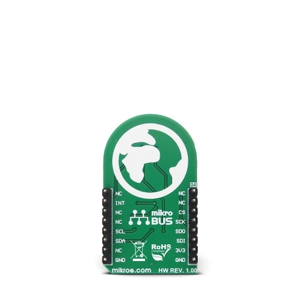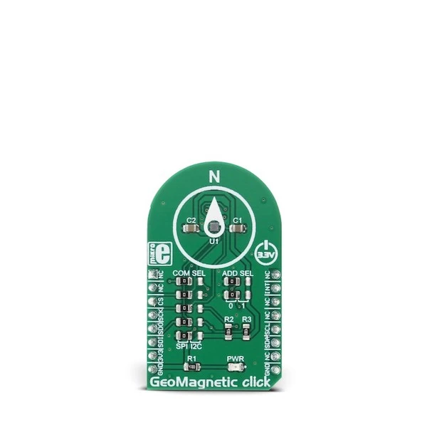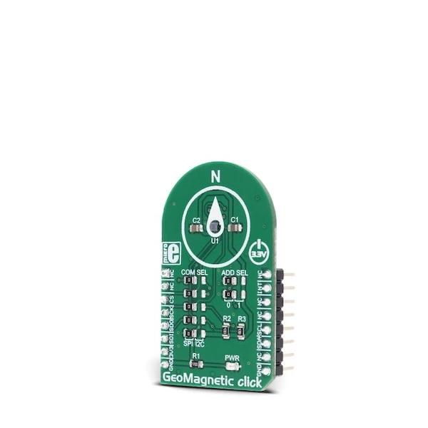 GeoMagnetic Click carries the BMM150, a three-axis geomagnetic sensor from Bosh Sensortec. Featuring the proprietary FlipCore technology from Bosch, low power consumption, and noise, as well as thermally compensated measurements, this device is specially tuned and tailored to be used in demanding 3-axis mobile applications.