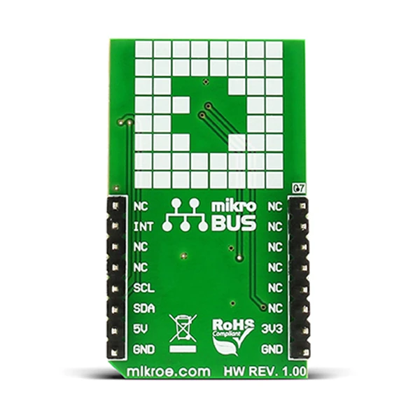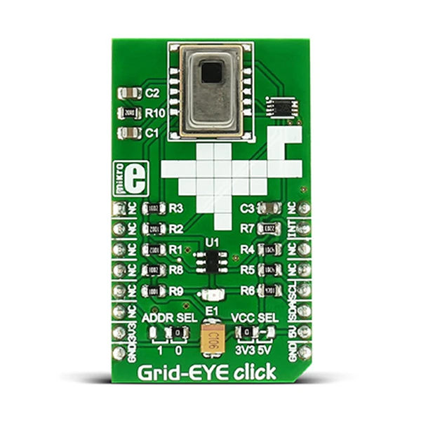 Grid-EYE Click is a 8×8 thermal array sensor-detector that carries the AMG8853 infrared array sensor from Panasonic. The Click is designed to run on either 3.3V or 5V power supply. It communicates with the target MCU over I2C interface.