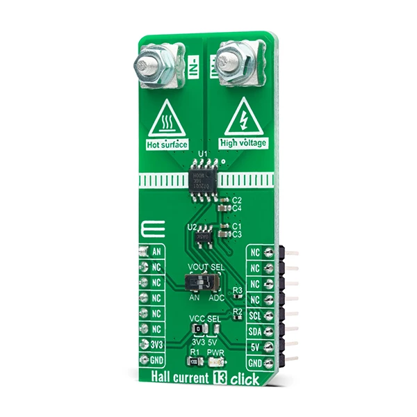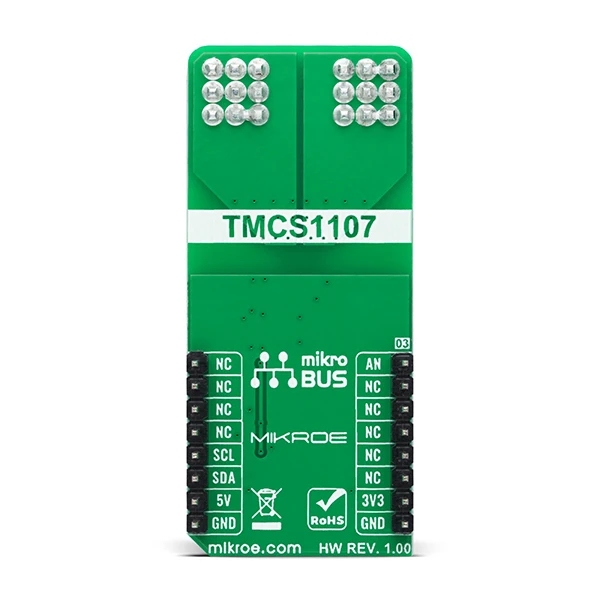 Hall Current 13 Click is a compact add-on board that provides economical and precise AC or DC current sensing solutions. This board features the TMCS1107-Q1, a galvanically isolated Hall-effect current sensor capable of DC or AC current measurement with high accuracy, excellent linearity, and temperature stability from Texas Instruments. It enables the lowest drift, <3% full-scale error, and highest accuracy over time and temperature. It also provides a reliable 420V lifetime working voltage and 3kVRMS isolation between the current path and circuitry with uni/bidirectional current sensing. Besides, the user is allowed to process the output signal in analog or digital form. This Click board™ is suitable for AC or DC current-sensing in industrial and commercial systems, motor and load control, power factor correction, overcurrent protection, and many more.