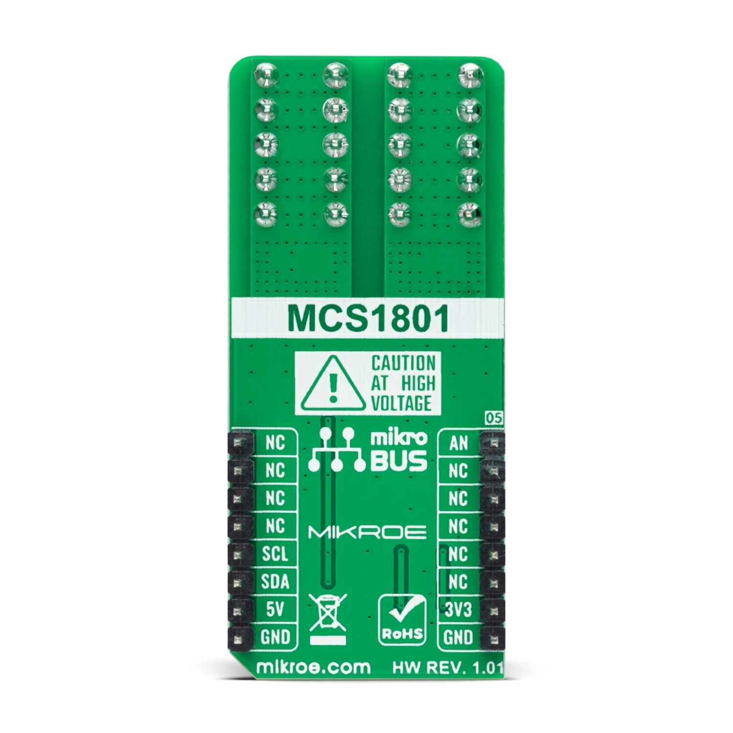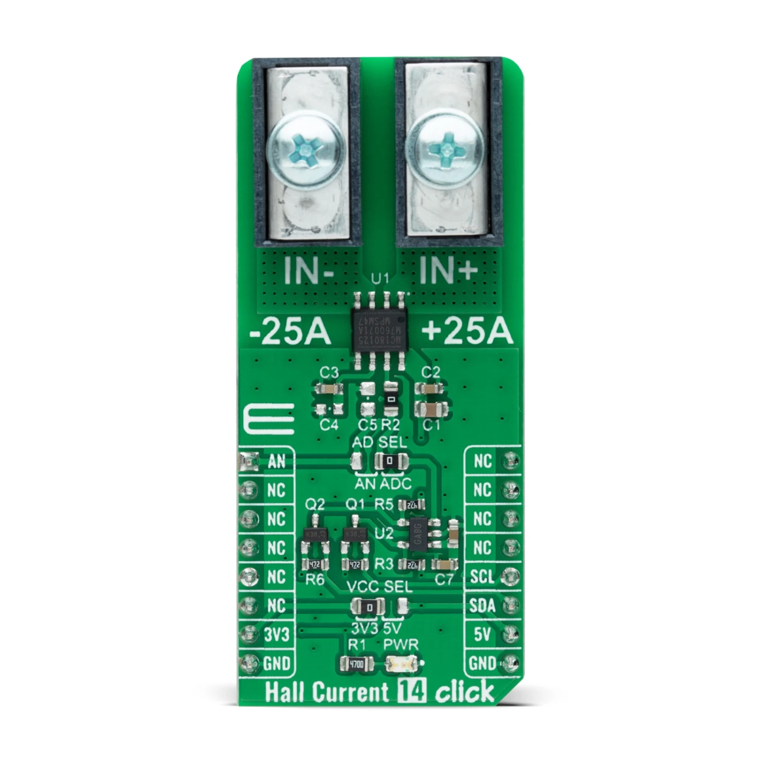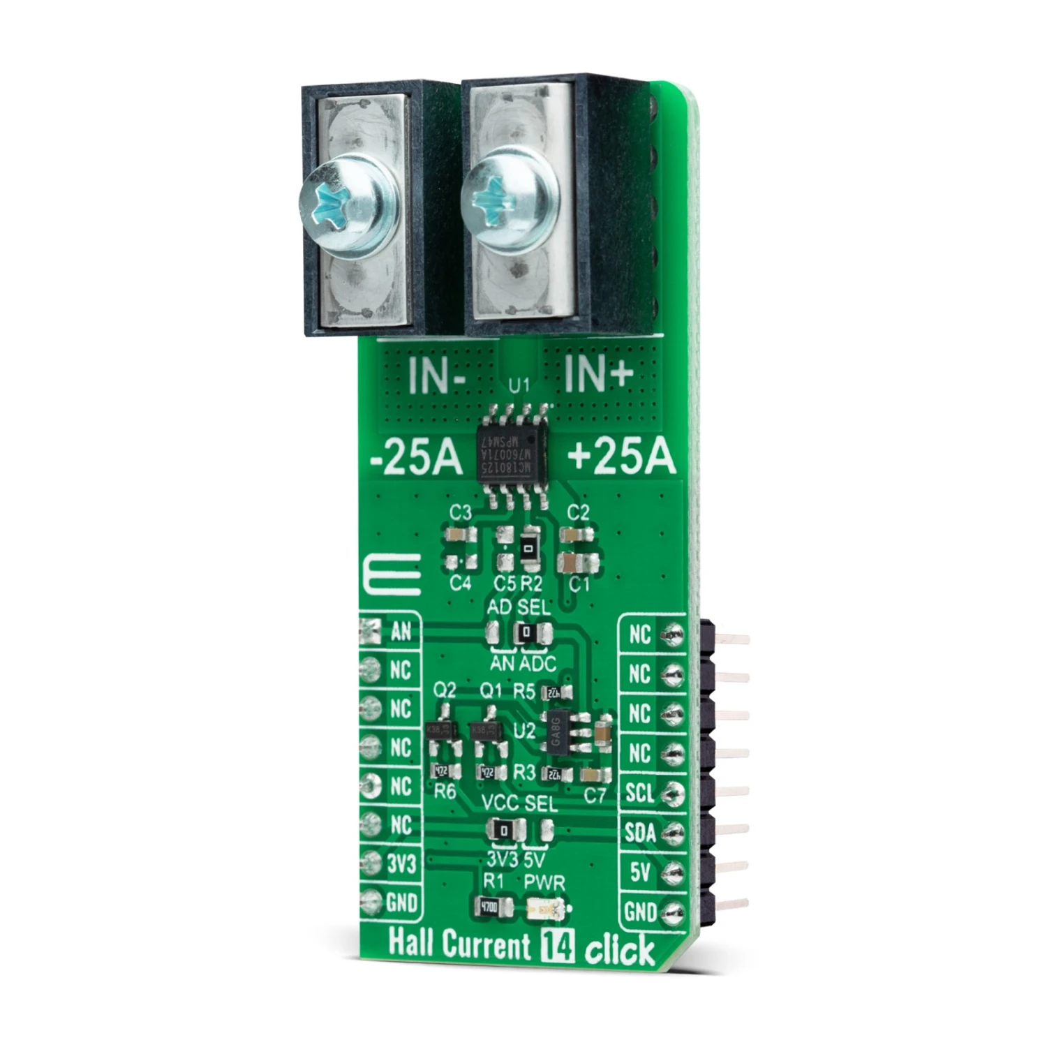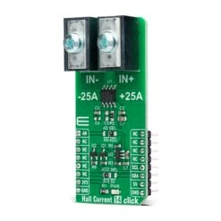 Hall Current 14 Click is a compact add-on board that contains a precise solution for AC/DC current sensing. This board features the MCS1801, a fully integrated Hall-effect-based isolated linear current sensor designed for the current range of ±25A from Monolithic Power Systems (MPS). The galvanic isolation between the pins of the primary copper conductive path and the sensor leads allows the MCS1801 to replace optoisolators or other isolation devices. Applied current flowing through this copper conduction path generates a magnetic field that the differential Hall sensors convert into a proportional voltage, where after that, the user is given the option to process the output voltage as an analog or digital value. This Click board™ is ideal for applications requiring a combination of high-current monitoring and high isolation voltage between the primary high-current and low-voltage sides.