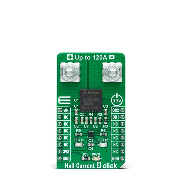 Hall Current 8 Click is a compact add-on board that contains a precise solution for AC/DC current sensing. This board features the TLI4971-A120T5, a high-precision coreless current sensor for industrial/consumer applications from Infineon Technologies. The TLI4971-A120T5 has an analog interface and two fast overcurrent detection outputs, which support the protection of the power circuitry. Galvanic isolation is also provided according to the magnetic sensing principle. Infineon’s monolithic Hall technology enables accurate and highly linear measurement of currents with a full scale up to 120A. This Click board™ is suitable for AC/DC current measurement applications: electrical drives, general-purpose inverters, chargers, current monitoring, overload, over-current detection, and many more.