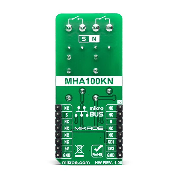 Hall Switch 2 Click as its foundation uses the MHA100KN, a high-performance, low-power Hall-Effect sensor from MEMSIC. This Click board™ detects the presence and magnitude of a magnetic field using the Hall effect. It consists of two high-quality relays, which the MHA100KN activates. When the north pole magnetic field is introduced to the sensor, one of the relays will be activated; otherwise, the other relay will be activated.