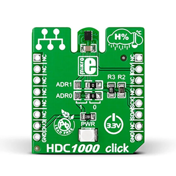 HDC1000 Click is a humidity (and temperature) measurement Click board™ carrying the HDC1000 sensor from TI. Its chief features are low power consumption, precision, and resistance to dust, dirt, and similar environmental contaminants. The relative humidity (0-100%RH) is measured with an accuracy of ±3%; the temperature is measured within a range from –20°C to 85°C with ±0.2°C accuracy. HDC1000 Click communicates with the target board MCU through mikroBUS I2C and INT lines. It operates as a peripheral device on the I2C interface. A pair of onboard jumpers allow you to specify the peripheral byte address, with four to choose from. The board is designed to use a 3.3V power supply only.