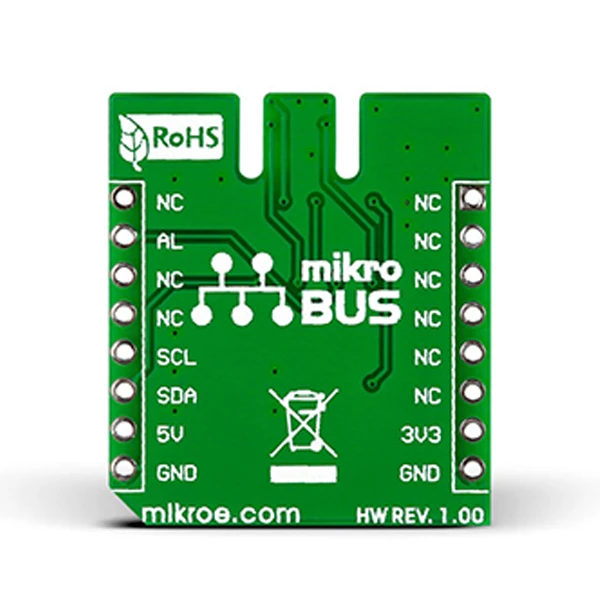 IrThermo 2 Click is a non-contact temperature measurement solution. The Click board™ carries the TMP007 infrared thermopile sensor with an integrated math engine. The sensor absorbs the infrared radiation emitted by the target object (withing the sensor’s field of view) and the integrated math engine calculates its temperature by comparing it with the temperature of the silicon die. The measurement range of the sensor is between –40°C to 125°C (with a 14-bit resolution). The board is designed to use either a 3.3V or a 5V power supply.