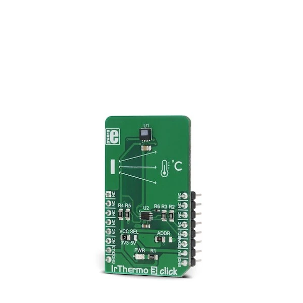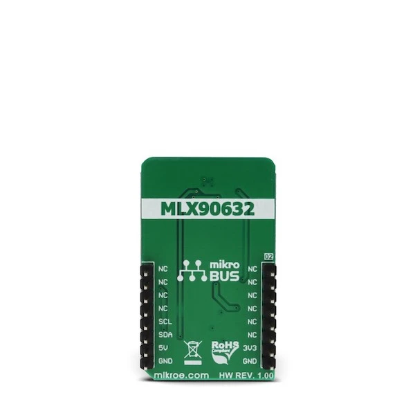 IrThermo 3 Click is a device which allows contactless measurement of the object temperature. It uses highly advanced MLX90632 FIR sensor, which detects the average temperature of objects within its field of view (FOV), which is typically ±25°. It is factory calibrated, with the calibration constants stored in its internal EEPROM. Besides EEPROM used for storing trimming values, device settings, and calibration constants, it has additional RAM area that can be used for auxiliary measurement data storage. The integrated temperature sensor provides ambient temperature measurement, necessary for a proper calibration. The device is calibrated to sense objects with the temperature ranging from -20 ℃ up to 200 ℃, and the ambient temperature ranging up to 80℃. The measurement resolution is 0.02℃. Measured data is available via the industry standard I2C communication bus.