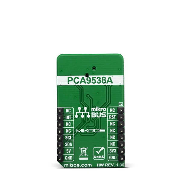 As already mentioned above, this Click board™ contains the port expander, relatively large number of needed GPIO pins for the joystick switch. Used IC is PCA9538A, Low-voltage 8-bit I2C-bus I/O port with interrupt and reset, from NXP Semiconductors. It uses the I2C communication for interfacing with the main MCU, which simplifies the number of needed pins, and therefore the design itself. The Active LOW reset input (RESET) and Open-drain active LOW interrupt output (INT) pins helps simplifying the design even further.