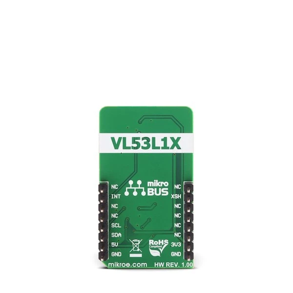 The highly integrated VL53L1X ToF sensor encompasses several integrated sections. It has an embedded MCU, OTP memory, RAM area, ROM area, ranging processing unit and the VCSEL driver. It exposes a simple I2C interface for the communication with the host MCU, offering a range of registers, used for configuring and status reporting. In addition, it offers an interrupt (INT) and XSH (XSHUT) pins routed to the mikroBUS™. Highly configurable interrupt engine allows this pin to be configured to generate interrupt signals for various events, alerting the host MCU about some important status changes, such as the Data Ready event, for example. It can be set to work in both open-drain configurations, as well as in the push-pull mode. Besides the INT pin, XSH pin is also avalible on the Click board™, which can be used for shuting down the main IC. The Click board™ is equipped with the 10K pull-up resistors, so it is advised to configure the INT and XSH pins in open-drain mode.