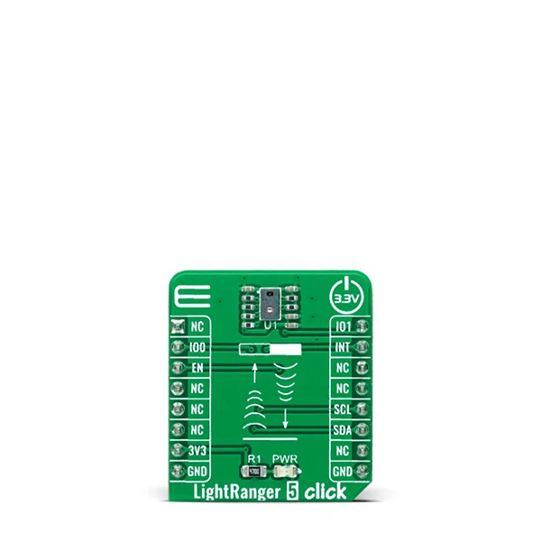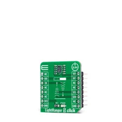 LightRanger 5 Click is a compact add-on board that contains a ranging sensor with multi-target detection. This board features the TMF8801, a dToF (direct time of flight) optical distance sensor achieving up to 2500mm target detection distance from company AMS-TAOS. It offers highly accurate depth accuracy detection through a sub-nanosecond light pulse and an anti-aliasing “stop-watch” method to measure the round-trip time of the pulse. It makes precise distance measurements up to a 2500mm distance range, and it is capable of operation in dark environments and the presence of sunlight. This Click board™ is suitable for presence (object) detection, distance measurement, industrial ranging, inventory control, optical switch, and many other applications.