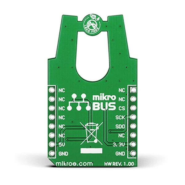 LIN HALL Click carries an MLX90242 linear Hall sensor IC (with built-in active error correction circuitry) and an MCP3201 12-bit ADC. It outputs a signal that is proportional to the flux density of a magnetic field—a north magnetic field will increase the output value while a south magnetic field will cause it to decrease. The ratiometric output allows you to infer the linear or rotary position of a target object by placing magnets on it. LIN HALL Click communicates with the target board through the mikroBUS™ SPI lines (CS, CSK, MISO). The board is designed to use either a 3.3V or a 5V power supply.