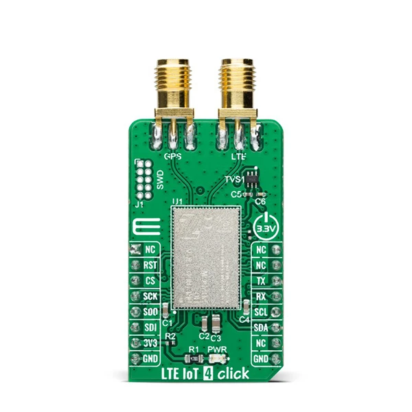 LTE IoT 4 Click is a compact add-on board that contains an IoT module with worldwide coverage. This board features the nRF9160, highly integrated, low-power SiP with LTE-M/NB-IoT and GPS from Nordic Semiconductor. The nRF9160 has an integrated ARM® Cortex®-M33 processor supported by 1MB of Flash and 256KB RAM memory with advanced security features. It can operate globally, eliminating any need for regional variants, and supports SIM connection and authentication with mobile network operators. This Click board™ is suitable for applications such as logistics and asset tracking, predictive maintenance, industrial, smart agriculture, and many more.