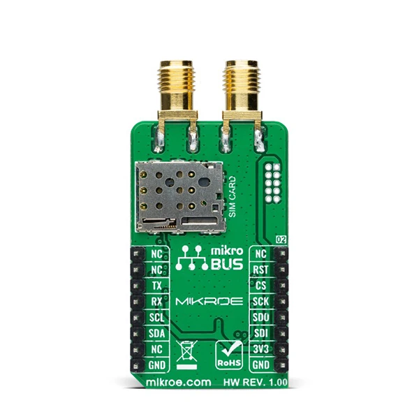 The LTE modem integrates a very flexible transceiver that supports frequency range from 700 to 2200 MHz. Also, it possesses two SMA antenna connectors with an impedance of 50Ω, labeled as GPS and LTE, used for connecting the appropriate antenna. Besides those SMA connectors, this Click board™ also has a nano-SIM card slot that provides multiple connections and interface options.