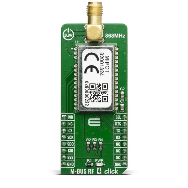 M-BUS RF 4 Click is a mikroBUS™ add-on board with a MIPOT 32001324 RF wireless transceiver. This module operates in the 868 MHz SRD Band. Thanks to its small LCC form factor (15 x 25 mm only) and its low power consumption this module allows the implementation of highly integrated low power (battery operated) solutions for water, gas, heat or electricity metering applications, both on meter or concentrator devices.