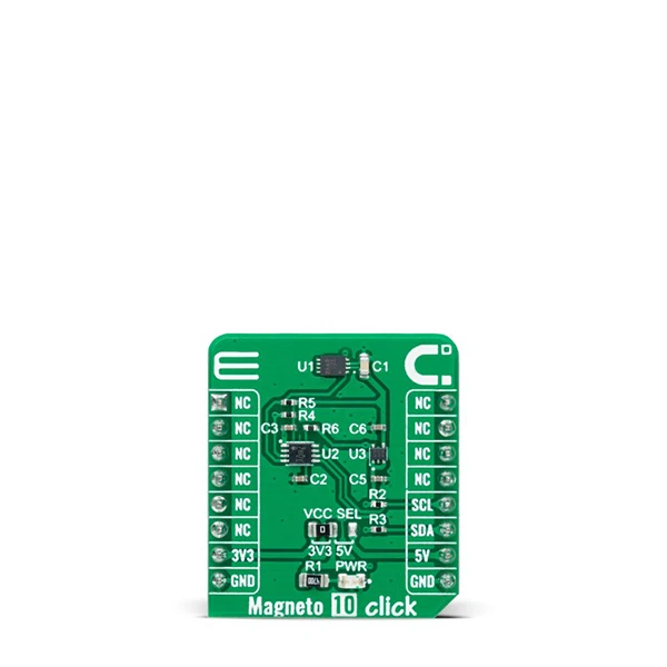 MIKROE Magneto 10 Click is a compact add-on board that contains a 3D magnetometer. This board features the MLX90392, a +/-5mT range magnetometer for low-noise applications from Melexis Technologies. The MLX90392, specially designed for micropower applications, measures magnetic fields along the three axes (X, Y being in a plane parallel to the surface of the die, and Z being perpendicular to the surface). Those measurements and the MLX90392’s temperature are converted into 16-bit words, transferred upon request over I2C communication. This Click board™ is suitable for position sensing requiring a small magnetic range and precise position measurement where noise is a critical design parameter.