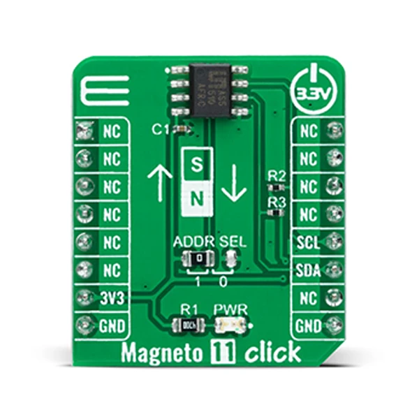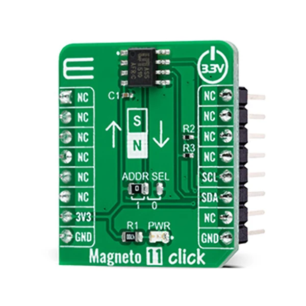 Magneto 11 Click is a compact add-on board that contains an accurate and reliable magnetic sensing device. This board features the AS5510, a linear hall sensor with 10-bit resolution, and an I2C interface from ams AG. It can measure the absolute position of lateral movement of a simple 2-pole magnet. A lateral stroke of 0.5mm ~ 2mm can be measured with air gaps around 1.0mm, depending on the magnet size. The AS5510 may be switched to a Power-Down state when it is not used to conserve power. This Click board™ is suitable for position sensing applications requiring a small magnetic range where noise is a critical design parameter.