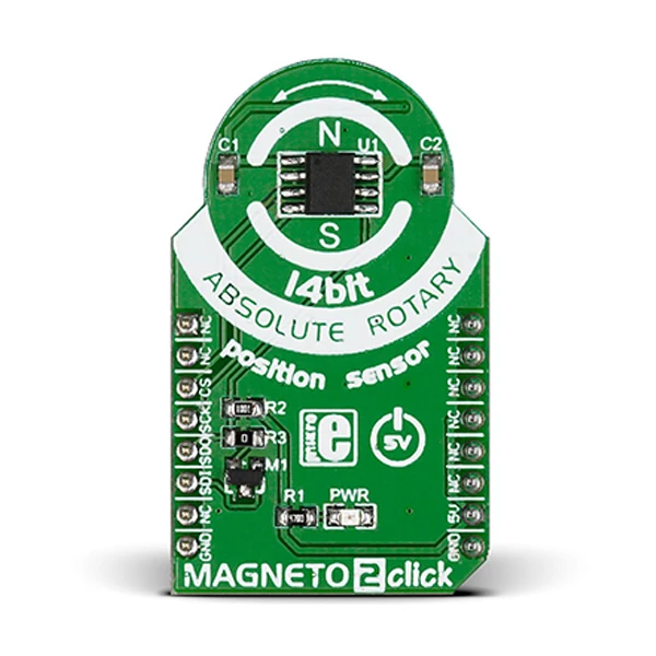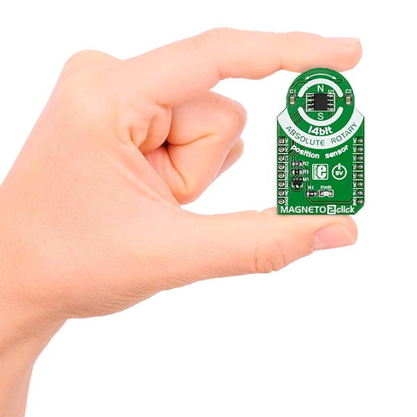 Magneto 2 Click is a mikroBUS™ add-on board with Melexis’s MLX90316 monolithic rotary position sensor. Sensing flux density with the IC surface of the MLX90316 allows the Click to decode the absolute rotary (angular) position from 0 to 360 degrees.