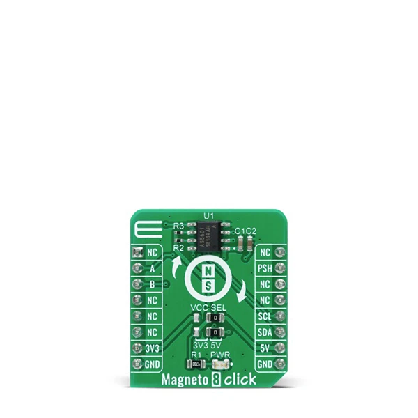 Magneto 8 Click is a compact add-on board that contains an easy-to-program magnetic rotary position sensor with incremental quadrature (A/B) and 12-bit digital outputs. This board features the AS5601, 12-bit programmable contactless encoder IC from AMS-AG. This Click board™ is based on a planar Hall sensor technology, supports industry-standard I2C interface, and it measures the orthogonal component of the flux density (Bz) from an external magnet. It also provides a smart low-power mode which automatically reduces power consumption. Magneto 8 Click has many features that make it attractive for various applications such as angular position measurement solutions, encoder replacement, contactless magnetic position sensors, and more.