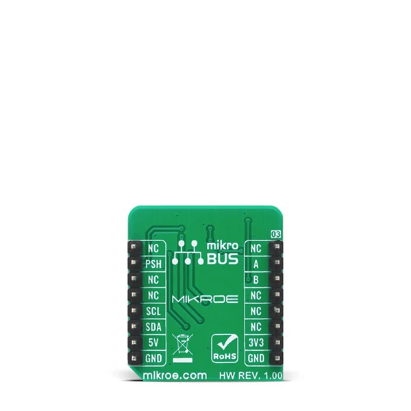 This Click board™ uses the I2C communication interface with both 3.3V and 5V. The onboard SMD jumper labeled as VCC SEL allows voltage selection for interfacing with both 3.3V and 5V MCUs. More information about the AS5601’s functionality, electrical specifications, and typical performance can be found in the attached datasheet. However, the Click board™ comes equipped with a library that contains easy to use functions and a usage example that may be used as a reference for the development.