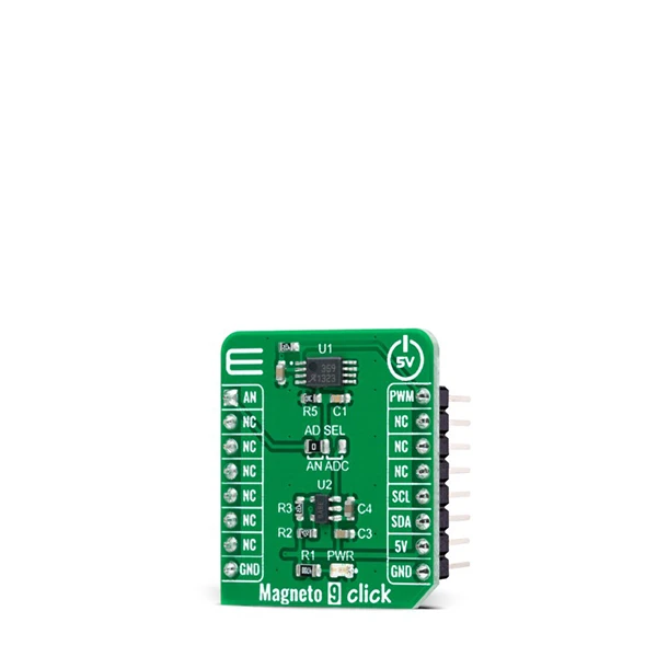 MIKROE Magneto 9 Click is a compact add-on board that contains a low-power, accurate, and reliable magnetic sensing device. This board features the A1359, dual tracking output linear hall-effect sensor from Allegro MicroSystems. This ratiometric Hall-effect sensor provides an analog voltage and a PWM signal with a duty cycle proportional to the applied magnetic field. It comes with factory-programmed offset, sensitivity, and polarity, where the PWM output tracks the analog output to within a +/-3% mismatch. This Click board™ is the most suitable for use in automotive and industrial applications such as displacement and angular position, which requires high accuracy in conjunction with redundant outputs.