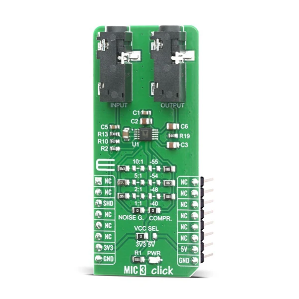 The MIC 3 Click based on the SSM2167-1RMZ-R7 from Analog Devices is a complete and flexible solution for conditioning microphone inputs in personal electronics and computer audio systems. The Click board™ is also excellent for improving vocal clarity in communications and public address systems. A low noise voltage-controlled amplifier (VCA) provides a gain that is dynamically adjusted by a control loop to maintain a set compression characteristic. The MIC 3 Click provides two operation settings, these settings are selectable with NOISE G. COMPR. jumpers.