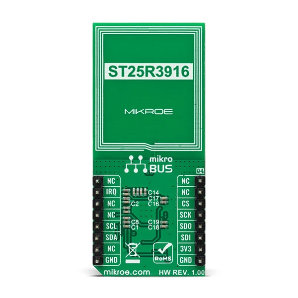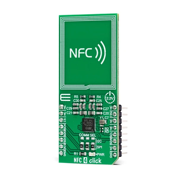 MIKROE NFC 4 Click is a compact add-on board that contains an NFC transceiver for contactless communication. This board features the ST25R3916, a multi-purpose NFC transceiver supporting passive peer-to-peer functionality and NFC card-emulation mode, as well as NFC reader operation from STMicroelectronics. It features high RF output power to directly drive an antenna etched on the PCB, alongside its tuning circuit, at high efficiency. The ST25R3916 also represents an EMVCo reader fully compliant with ISO 14443A/B, ISO 15693, ISO 18092, Felica, and NFC Forum standards. Thanks to the ST25R3916, this Click board™ provides all the features designers need to quickly market and comply with relevant NFC specifications. This Click board™ represents an ideal solution for rapidly integrating NFC technology in any custom application.