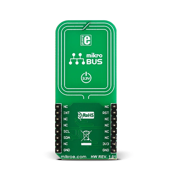 The board communicates with the target board MCU through the mikroBUS™ I2C interface, in compliance with NCI 1.0 host protocols (NCI stands for NFC controller interface). RST and INT pins provide additional functionality. The board uses a 3.3V power supply.