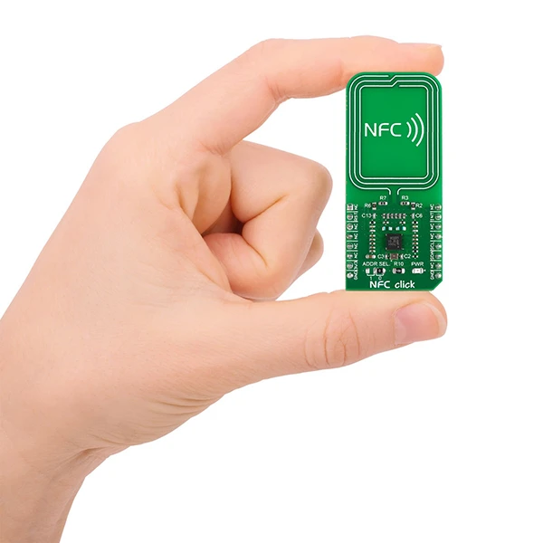 NFC Click is a mikroBUS™ add-on board with a versatile near field communications controller from NXP — the PN7120 IC. NFC devices are used in contactless payment systems, electronic ticketing, smartcards, but also in retail and advertising — inexpensive NFC tags can be embedded into packaging labels, flyers or posters.