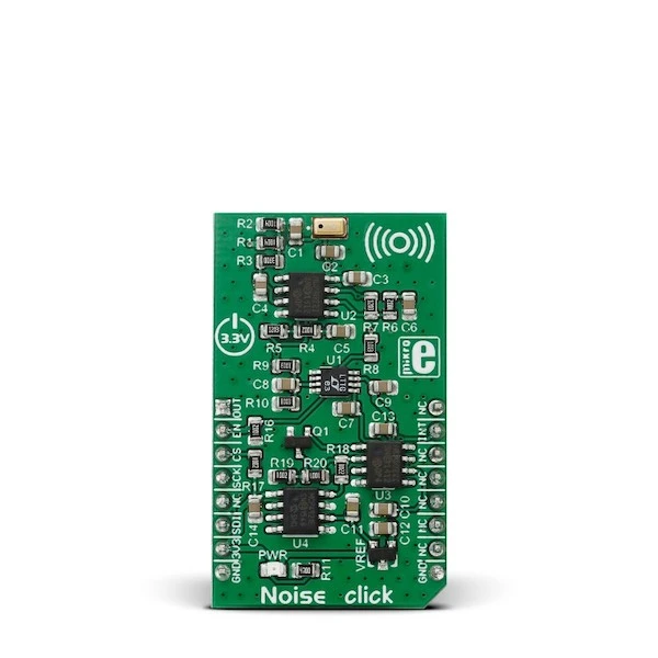 Noise Click is a mikroBUS™ add-on board with noise detecting circuitry. It enables you to set a noise detection threshold for alarm systems, environmental monitoring or data logging.