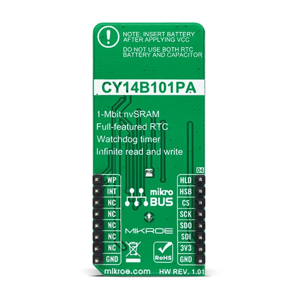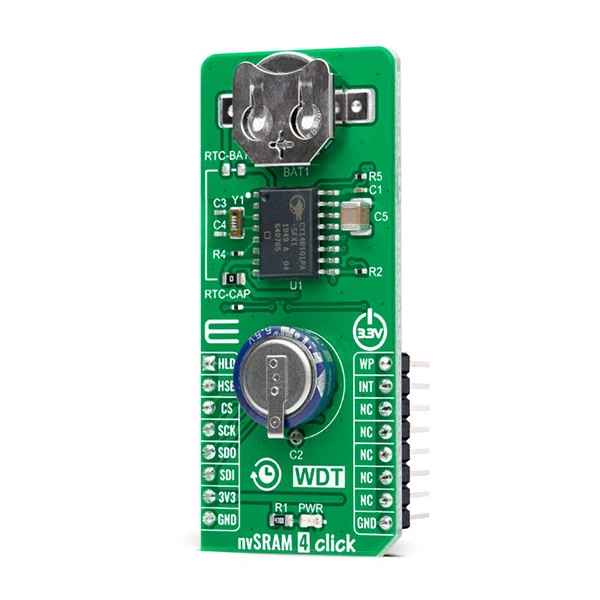 nvSRAM 4 Click is a compact add-on board that contains the most reliable nonvolatile memory. This board features the CY14B101PA, a 1-Mbit nvSRAM with a fully-featured real-time clock from Infineon. The memory is organized as 128K words of 8 bits each, where the embedded elements incorporate the QuantumTrap technology that provides highly reliable, nonvolatile data storage. It provides infinite read and writes cycles with an additional automatic backup switch. Data transfer, initiated by the user through SPI commands, takes place automatically at Power-Down. On the other hand, during the Power-Up, data is restored to the SRAM from the nonvolatile memory. This Click board™ is suitable for all applications that require fast access and high reliability of stored data, and unlimited endurance.
