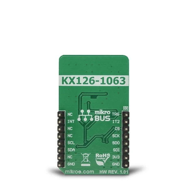 As previously mentioned, the KX126-1063 IC features a range of different detection algorithms, which are used to detect a range of movement and acceleration events. The pedometer functionality is one of these features. In the datasheet, a term engine is used. The pedometer engine can be disabled or enabled, it can have the signal filtering conditioning applied to it (so that the acceleration offset is removed, and the peak detection is improved), it can use a specific acceleration range from ±2g to ±16g, it can set its output data rate register to a specific value, it can have the step count overflow reported as the interrupt on one of the physical pins (INT1, and INT2 pins of the IC, routed to the mikroBUS™ INT and RST pins, respectively), step increment event can also be directed to trigger an interrupt on one of the INT pins. The step detection parameters of the pedometer engine itself can be configured by the user. There are ten pedometer control registers (PED_CNTL1 to PED_CNTL10) that cover various aspects of the pedometer engine, in addition to general configuration registers which are common to all engines of the KX126-1063 IC. These registers affect the step detection sensitivity, the number of steps discarded before the actual counting begins, the scaling factor, etc. The datasheet of the KX126-1063 IC offers a detailed explanation of each register and its function. However, the Click board™ comes with the mikroSDK compatible library which contains simplified functions, that allow simple setup of the KX126-1063 sensor IC and rapid application development.