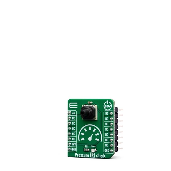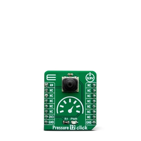 Pressure 12 Click is a barometric gauge pressure measuring Click board™, equipped with the Amplified Basic Pressure sensor series (ABP), which features a ratiometric analog output, which is proportional to the applied pressure. It features a very low Total Error Band of 1.5% of FS, a specification used to describe all the measurement errors and deviations within the sensor itself. The ABP series sensor uses a calibrated and thermally compensated ASIC, providing a ratiometric output updated at a frequency of 1kHz. It can be directly used by the A/D conversion section of the host MCU, but it can also be directly used in a control feedback loop, for low latency operations.