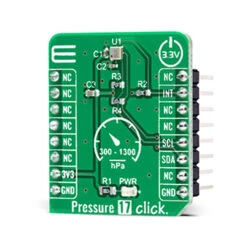 Pressure 17 Click is a compact add-on board that contains a board-mount pressure sensor. This board features the BM1390GLV-Z, a high-precision piezoresistive pressure sensor from Rohm Semiconductor. The BM1390GLV-Z comes with a configurable host interface that supports I2C serial communication and measures pressure in a range from 300hPa up to 1300hPa with an accuracy of ±1hPa. It also has a built-in temperature compensation function that internally performs temperature compensation for MEMS inside the chip, so it’s easy to get pressure information, built-in FIFO, and operation in a temperature range of -40°C to 85°C, which ensures stable operation under extreme conditions. This Click board™ is suitable for pressure measurements in automotive applications, industrial and consumer applications.