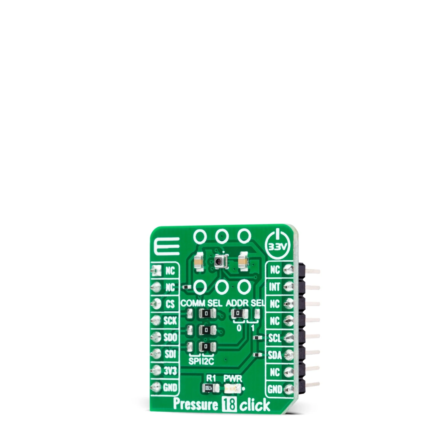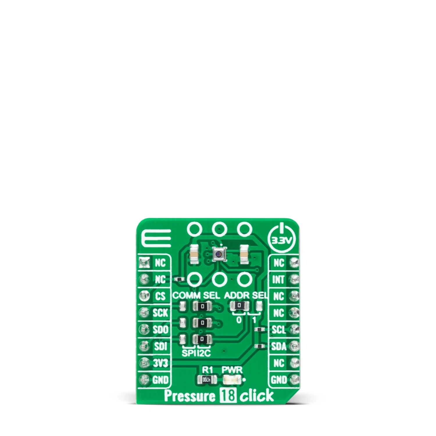 Pressure 18 Click is a compact add-on board that contains a board-mount pressure sensor. This board features the BMP384, a robust barometric pressure sensor delivering market-leading accuracy in a compact package from Bosch Sensortec. The BMP384 provides a relative accuracy of ±9Pa and typical absolute accuracy of ±50Pa with ultra-low noise, low power consumption, and a temperature coefficient offset of ±1Pa/K. It converts output data into a 24-bit digital value and sends the information via a configurable host interface that supports SPI and I2C serial communications. It measures pressure from 300hPa to 1250hPa over a wide operating temperature range. This Click board™ is suited for various pressure-based applications, altitude tracking, industrial, consumer, weather stations, and more.
