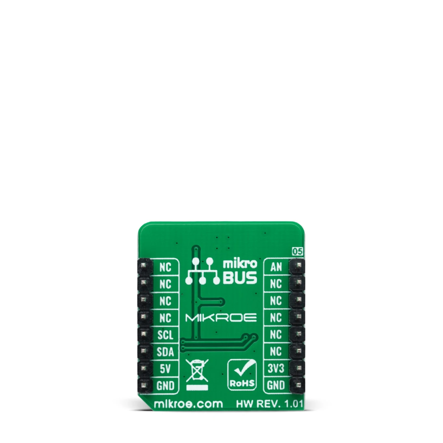 Since the sensor for operation requires a 5V logic voltage level only, this Click board™ also features the PCA9306 voltage-level translator from Texas Instruments. The I2C interface bus lines are routed to the dual bidirectional voltage-level translator, allowing this Click board™ to work with both 3.3V and 5V MCUs properly.