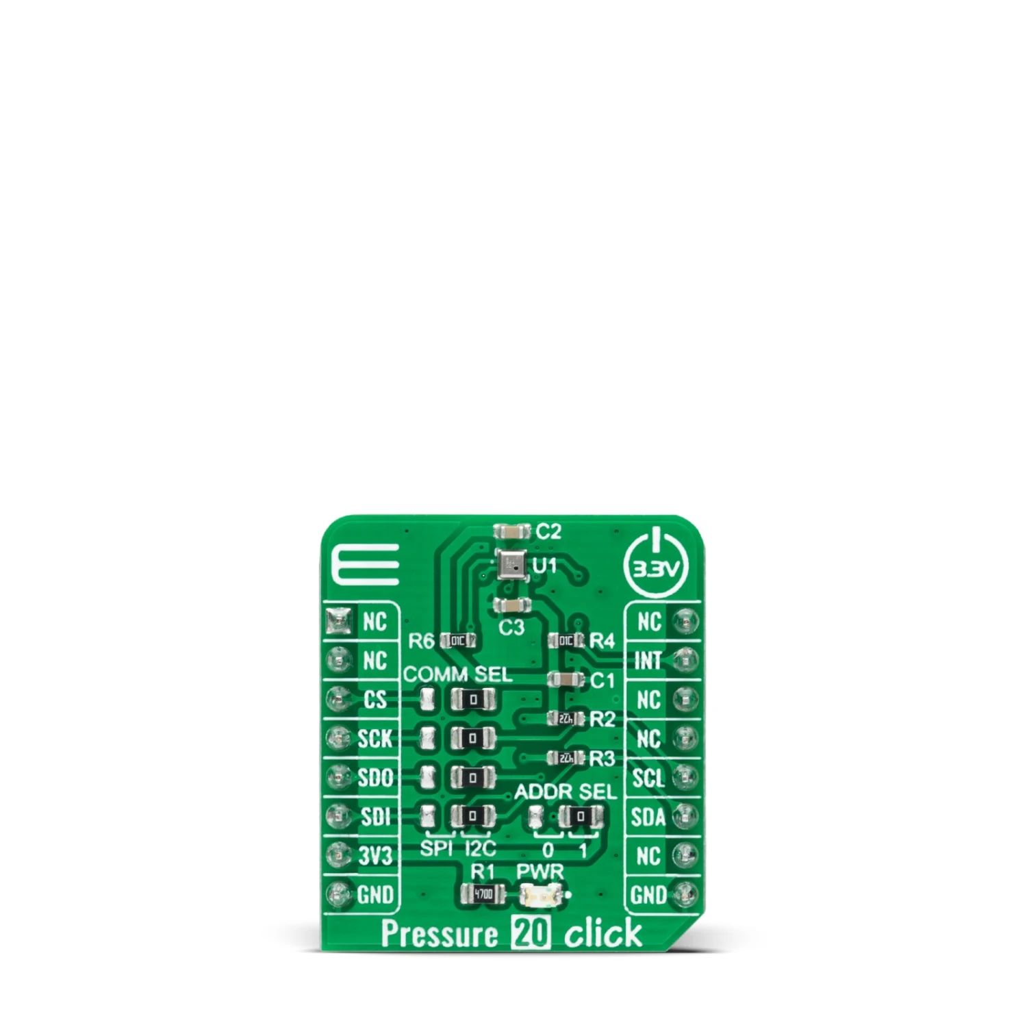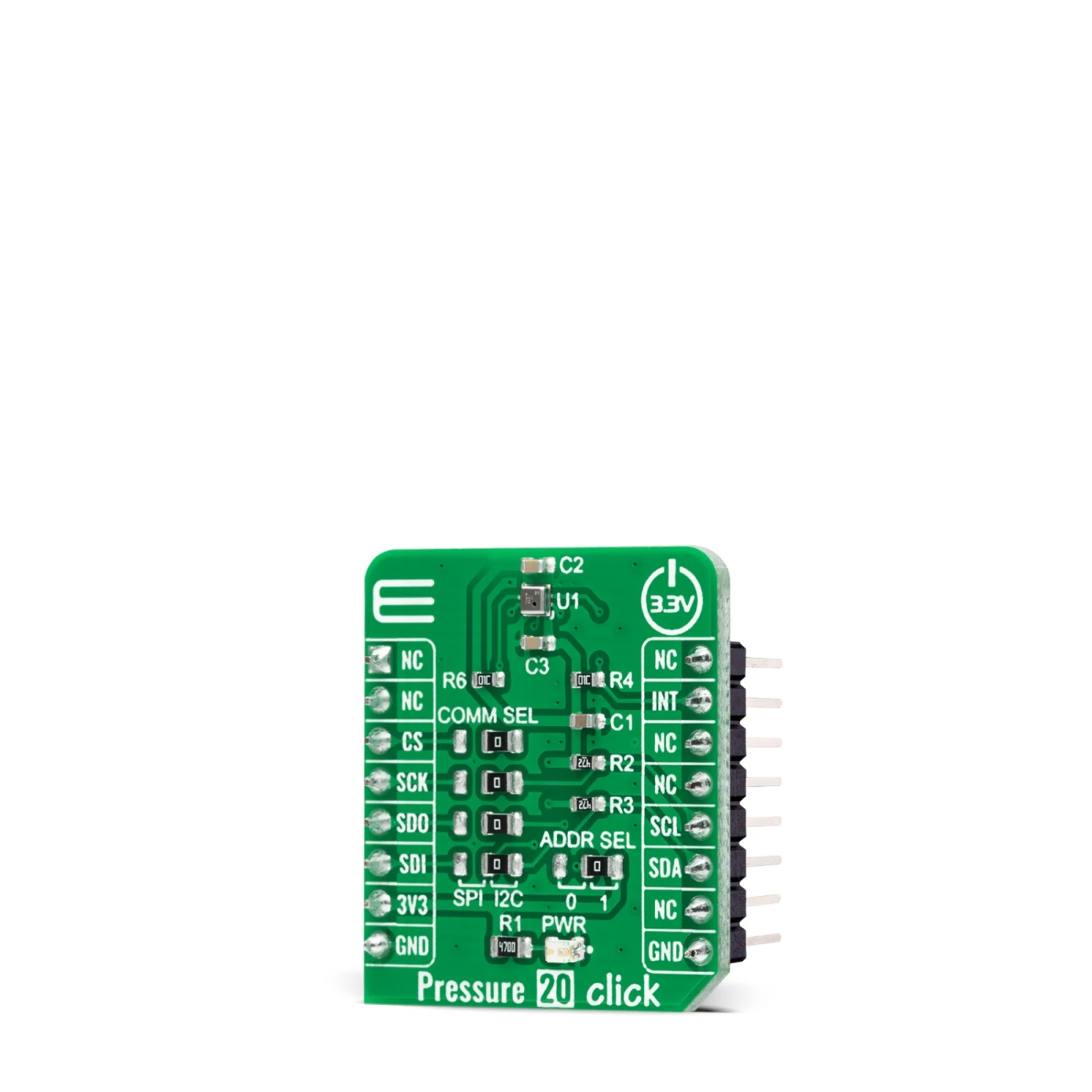 Pressure 20 Click as its foundation uses the ICP-20100, a high accuracy, low power, barometric pressure, and temperature sensor solution from TDK InvenSense. It integrates a capacitive pressure sensor for monitoring pressure changes in the range from 30kPa to 110kPa with an accuracy of ±20Pa over a wide operating temperature range. The ICP-20100 achieves the industry’s lowest pressure noise of 0.4Pa RMS while attaining the industry’s lowest power consumption and retains excellent temperature stability with a temperature coefficient of ±0.4Pa/°C.