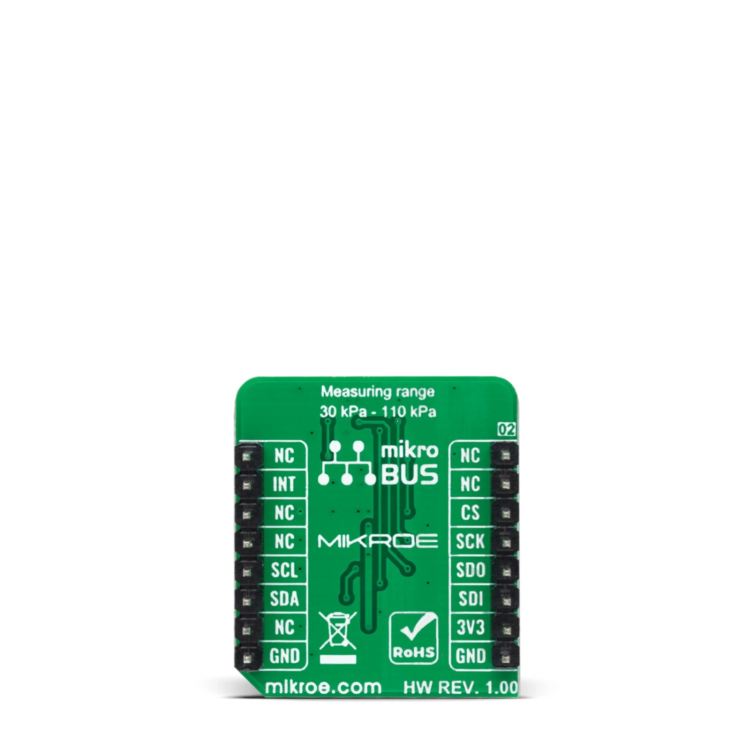 Pressure 20 Click is a compact add-on board that contains a board-mount pressure sensor. This board features the ICP-20100, a high-accuracy digital barometric pressure and temperature sensor from TDK InvenSense. The ICP-20100 is based on MEMS capacitive technology with ultra-low noise, low power consumption, and temperature stability alongside programmable output: all-pressure, all-temperature, or pressure and temperature output. It converts output data into a 20-bit digital value and sends the information via a configurable host interface that supports SPI and I2C serial communications. It measures pressure from 30kPa up to 110kPa with an accuracy of ±20Pa over a wide operating temperature range. This Click board™ is suited for various pressure-based applications, industrial, consumer, weather stations, and more.