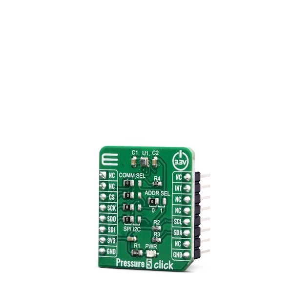 Pressure 5 Click is a barometric pressure measurement Click board™, which features the BMP388, an accurate absolute barometric pressure sensor. Due to its very high sensing accuracy, it is perfectly suited for precise altitude tracking applications. The BMP388 pressure sensor can use both SPI and I2C communication protocols, allowing it to be interfaced with a broad range of MCUs. The BMP388 features onboard processing capabilities such as the IIR filtering, which can be used to filter out abrupt pressure changes. Thanks to its very low power consumption, Pressure 5 Click to be used in a wide range of battery-powered and portable applications.