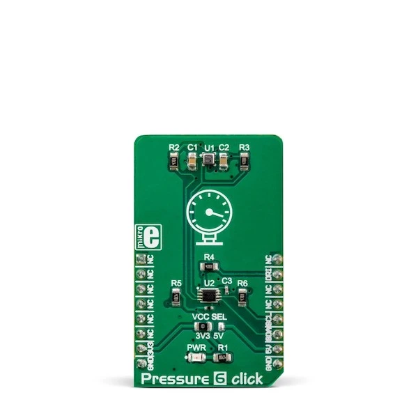 Pressure 6 Click features a simple, yet highly accurate and reliable pressure sensor labeled as BM1386GLV, produced by ROHM. This sensor is a piezo-resistive pressure sensor with internal thermal compensation, which greatly simplifies the pressure reading. Pressure 6 Click allows readings in the range from 300hPa up to 1300hPa, with the accuracy of ±0.12hPa. The Click board™ comes as a fully tested and approved prototype, making it a reliable device ready to use on the development board. The full package also includes the mikroSDK™ software and a library with all the functions.