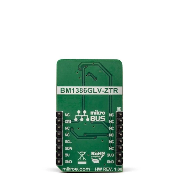 The conversion data is available over the I2C interface, as mentioned before. The I2C bus lines (SDA and SCL) are routed to the respective I2C mikroBUS™ pins which are pulled up by resistors on the Click board™ itself, allowing the Click board™ to be used right out of the box. The datasheet of the BM1386GLV IC offers conversion formulas which can be used to convert the raw binary values from the respective registers to physical, human-readable format. However, Pressure 6 Click comes with the library that contains functions which output properly formatted thermal and pressure readings.