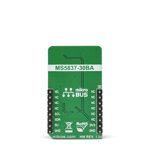 The main component of the Pressure 7 Click is the MS5837, a pressure sensor IC produced by TE Connectivity. This is a highly integrated piezo-resistive absolute pressure sensor, based on the MEMS technology by TE Connectivity, which can measure the pressure in the range from 0 to 30 bar, and the temperature in the range from -20° to +85° C. The MEMS (micro electromechanical sensor) is placed in a hermetically sealed, anti-magnetic stainless-steel cap, protected with the special gel. This makes the sensor itself water-resistant. Besides the piezo-resistive sensor, the MS5837 module also contains the highly integrated ASIC (Application Specific Integrated Circuit) which contains all the necessary components that are required to convert the uncompensated voltage from the MEMS into 24-bit digital data. The MS5837 sensor offers the standard I2C interface for the communication with the host MCU, using only a few commands.