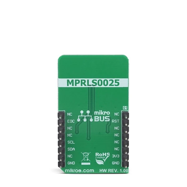 MPR series sensors offer many benefits, making them ideally suited to be used on many different application designs. By featuring the MPRLS0025PA00001A absolute pressure sensor, Pressure 8 Click is the perfect tool for development of pressure-based applications, including humidifiers, air beds, washing and dish machines, airflow monitors, and similar applications based on the accurate pressure measurement and monitoring.