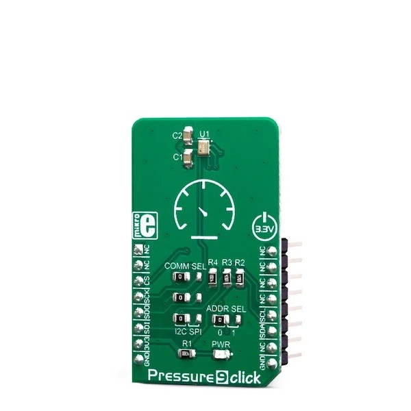 Pressure 9 Click supports both SPI and I2C communication interfaces, allowing it to be used with a wide range of different MCUs. The communication interface can be chosen by moving SMD jumpers grouped under the COM SEL to an appropriate position (SPI or I2C). The peripheral I2C address can also be configured by a SMD jumper, when operated in the I2C mode: a SMD jumper labeled as ADD SEL is used to set the least significant bit (LSB) of the I2C address. When set to 0, the 7-bit I2C peripheral address becomes 0b1110110x. If set to 1, the address becomes 0b1110111x. The last digit (x) is the R/W bit. Please note that each jumper should be moved to the same position, else the communication with the host MCU may not be possible.